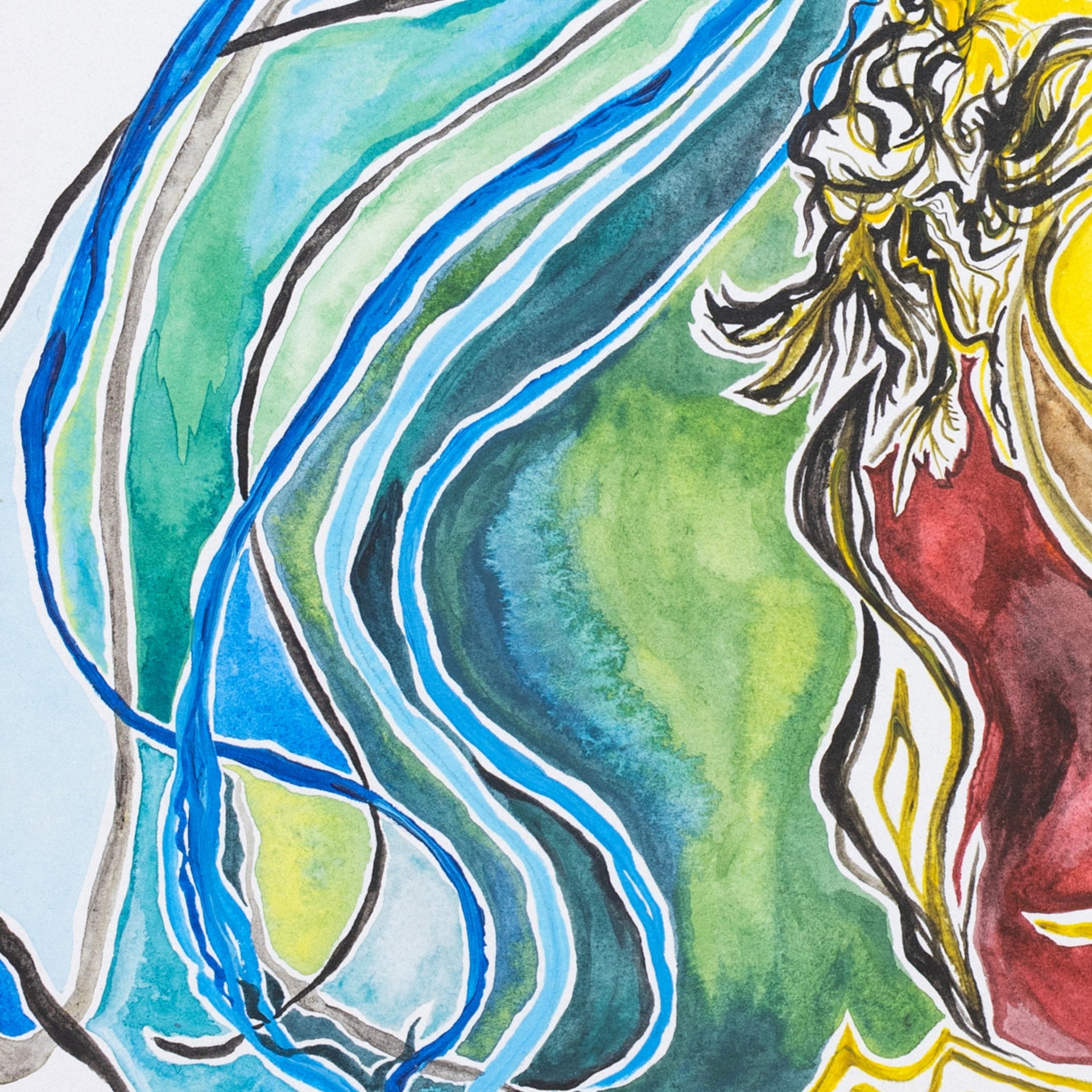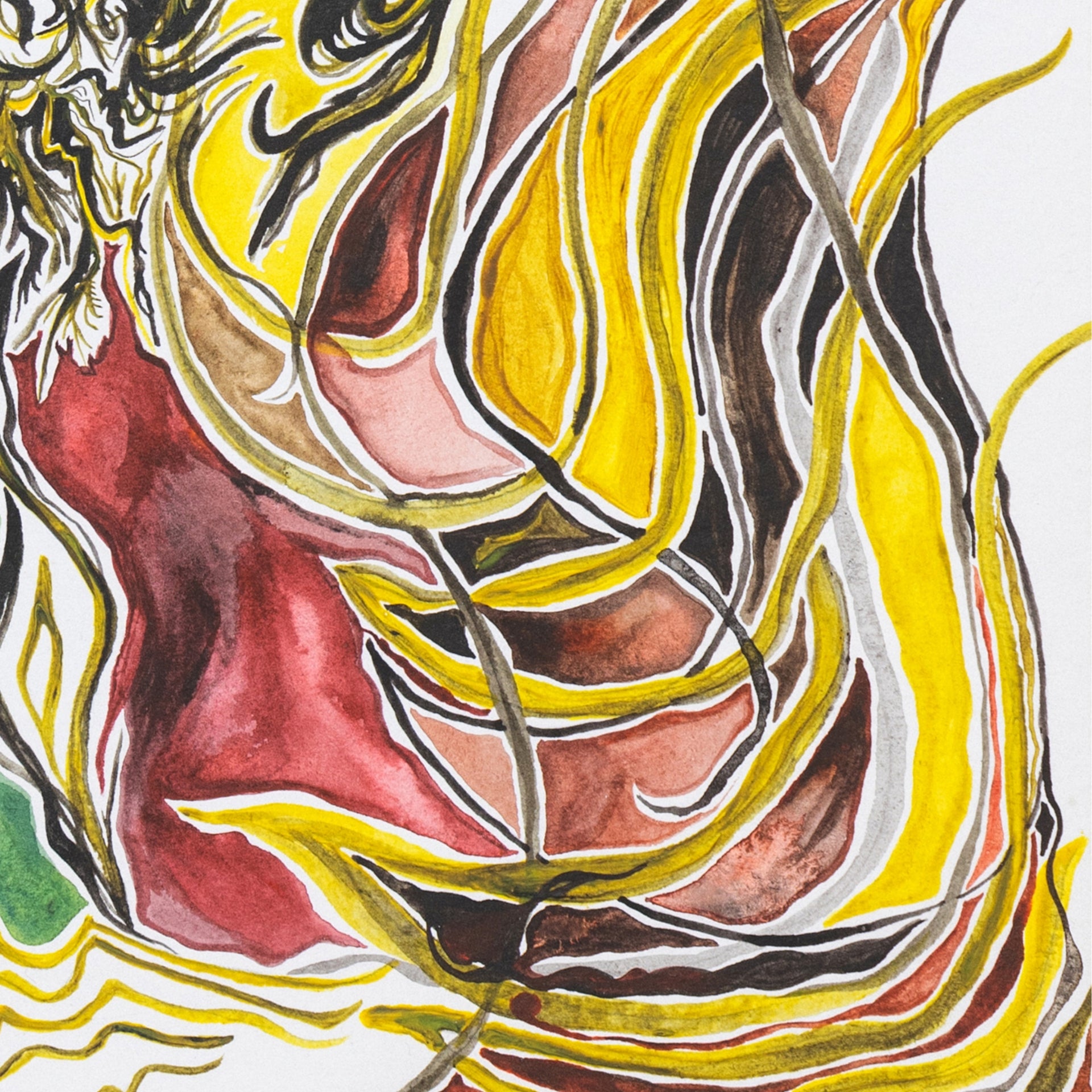 Through bold lines and organic shapes, the figure expands into landscape, shifting between body and terrain, origin and force.